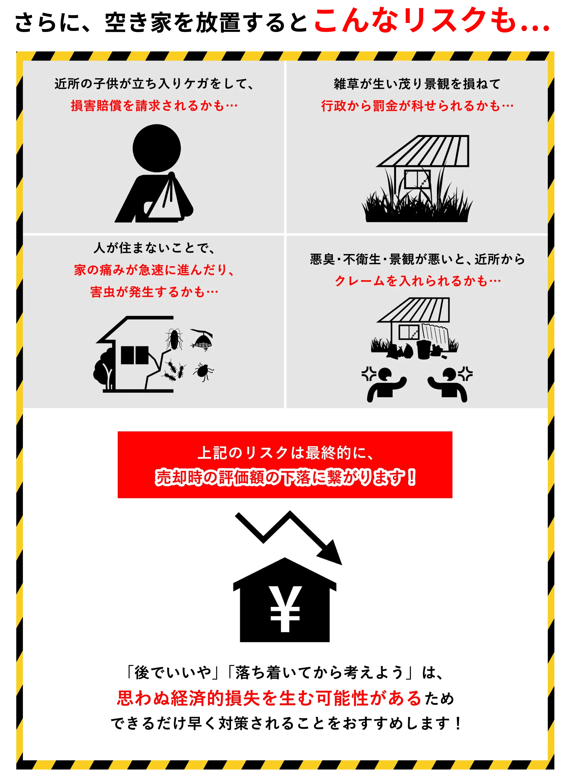 これらの状態で空き家のまま放置することは「百害あって一利なし」のため、早急な対処が必要です。